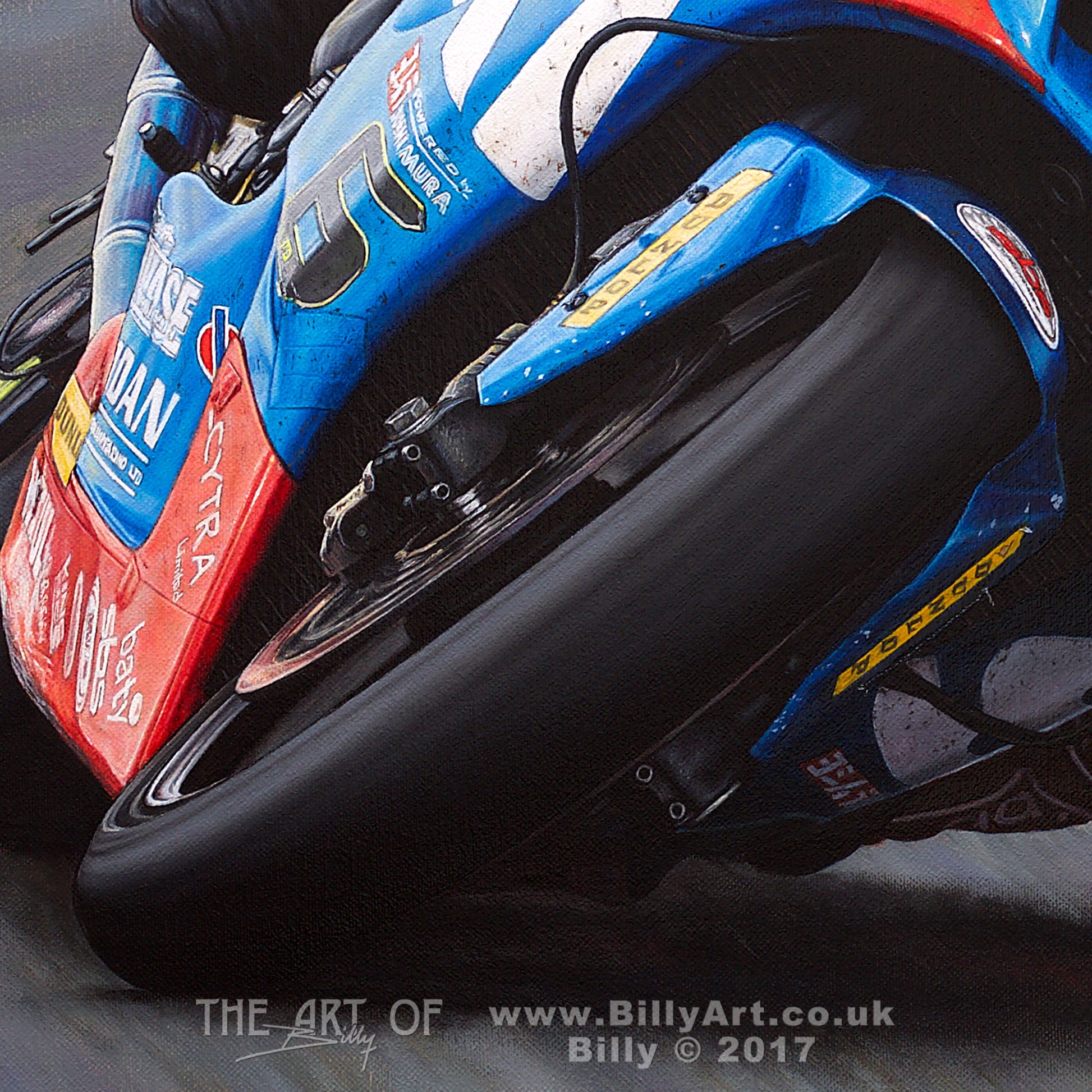 This limited edition print of Michael Dunlop is a giclée print on matte art paper using Ultrachrome K3 inks and each print is signed by Billy. The fine art prints of The Bull are taken from Billy the artist's oil on linen canvas painting of Michael Dunlop on the 2017 Suzuki GSXR.