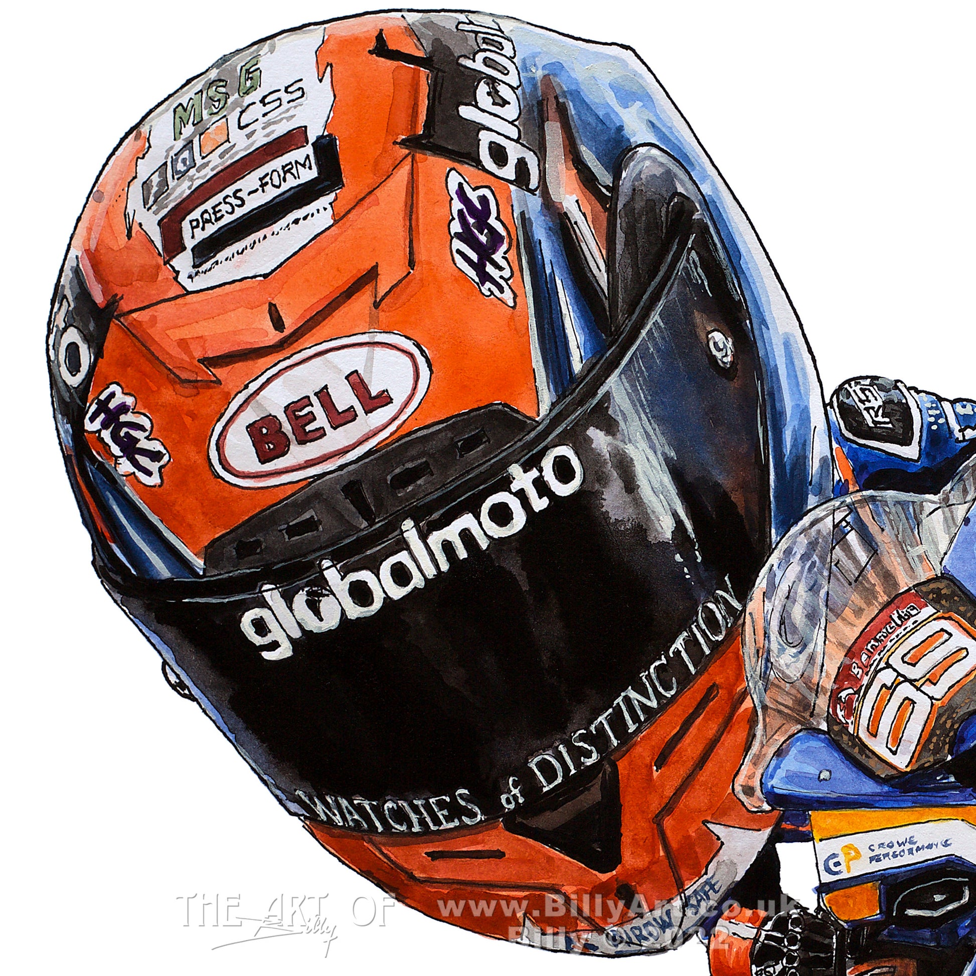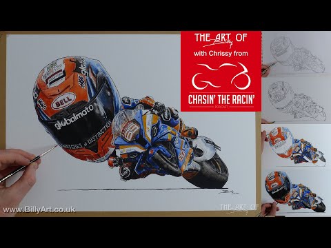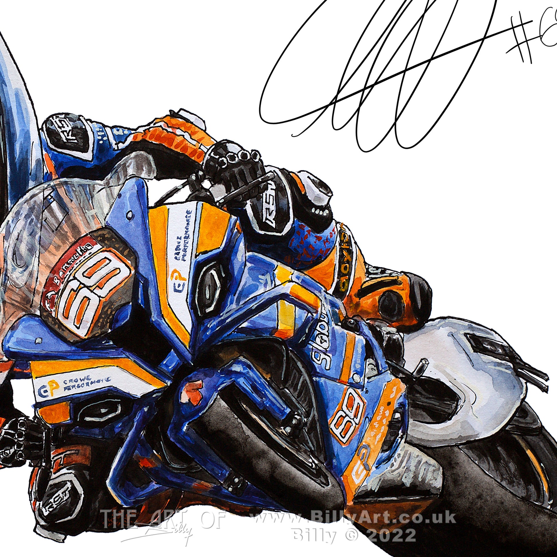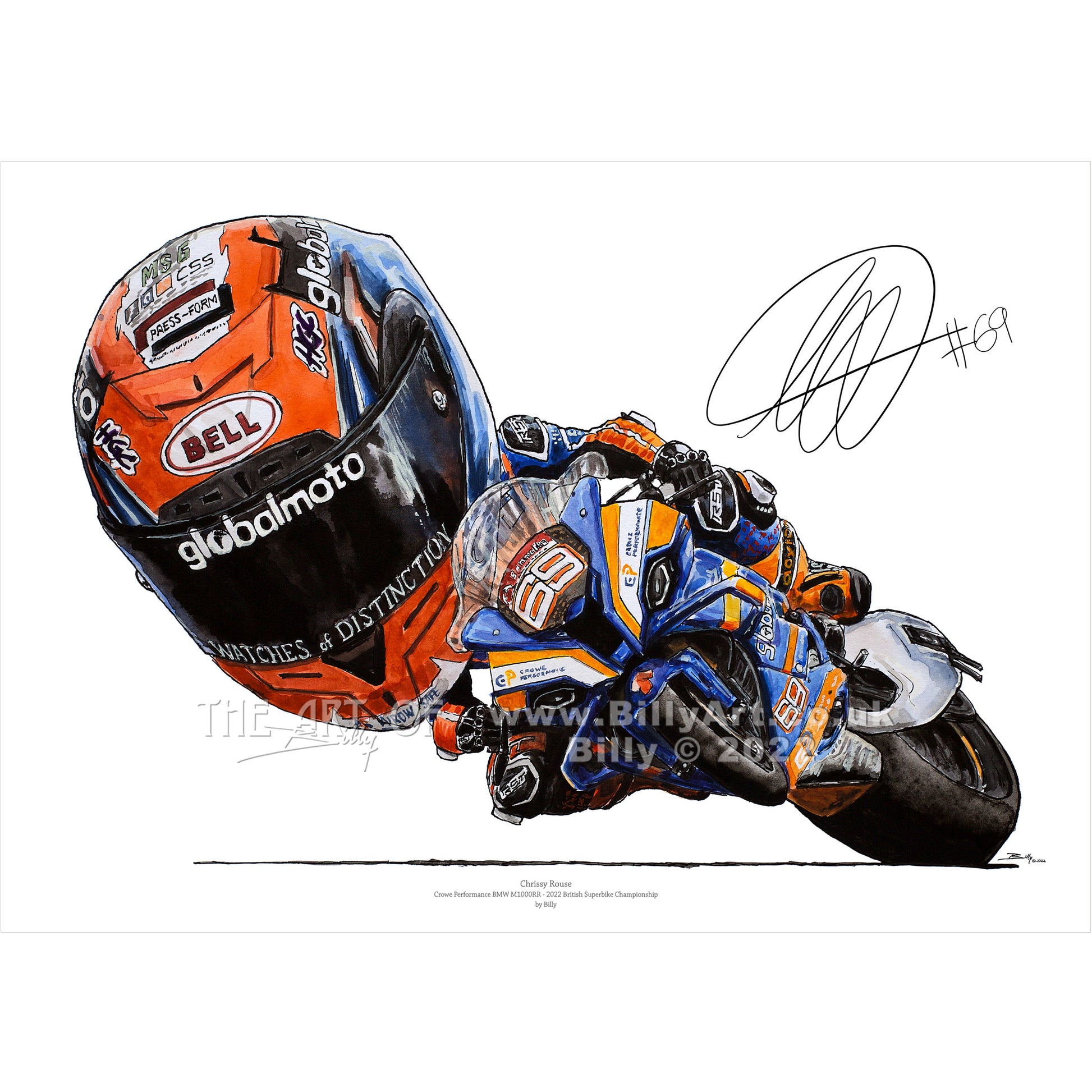 This cartoon art by Billy of Chrissy Rouse, from the Chasin' the Racin' Podcast with Dom Herbertson (now being continued into 2023 with rolling co-hosts Christian Iddon, Joe Akroyd and Josh Corner), Riding the Crowe Performance BMW M1000RR in the 2022 British Superbike Championship is avaivaialbe in A4, A3 or A2 with free UK PandP.
