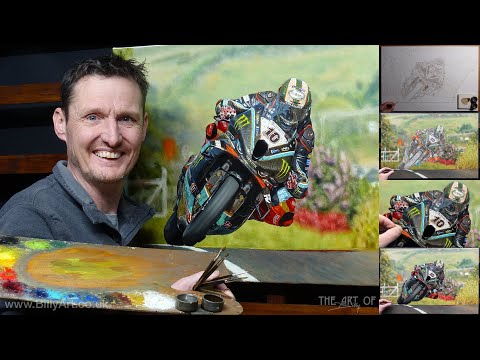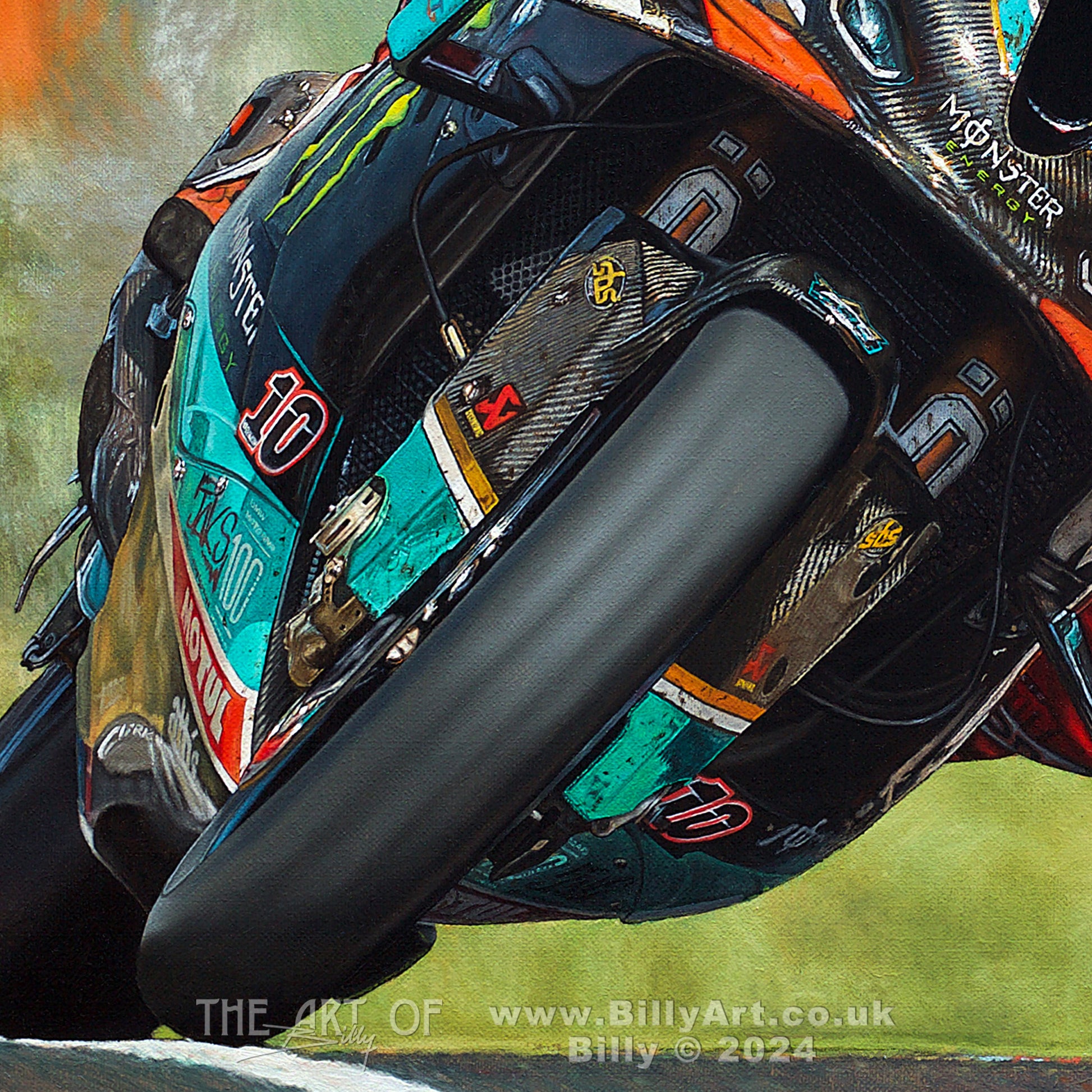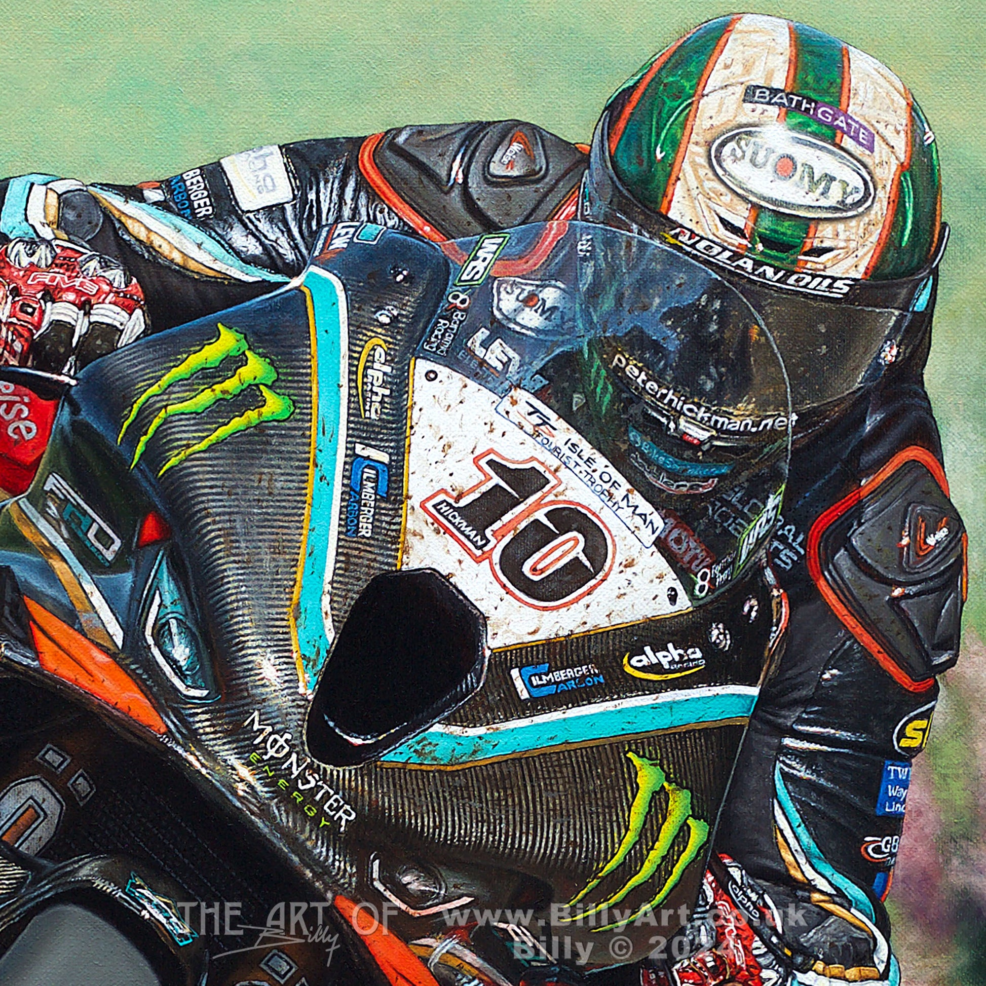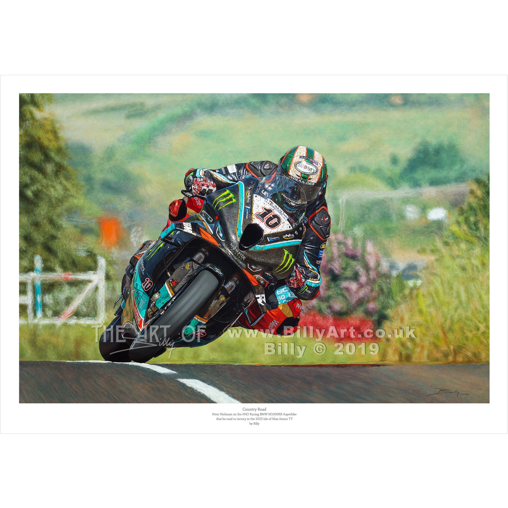 This oil painting by Billy of Peter Hickman riding the BMW M1000RR Superbike for FHO Racing in the 2023 Isle of Man Senior TT. Peter, the worlds fastest road racer, won his 13th TT race in 2023. The scene shows Peter just after Cronk-ny-Mona on the TT Course and it could easily be any 'Country Road' that bikers go for a spin on. The print is available in three sizes A4, A3 and A2.