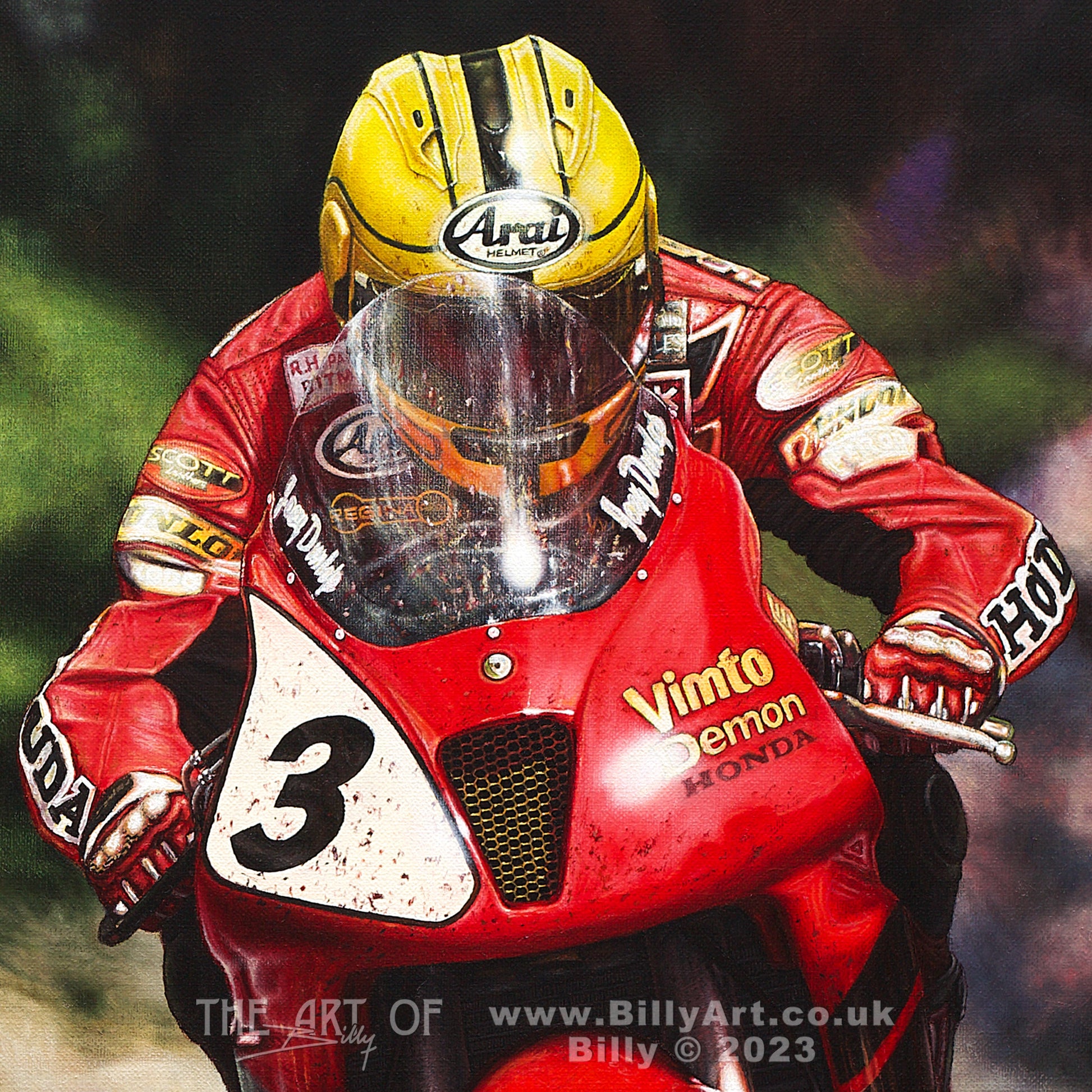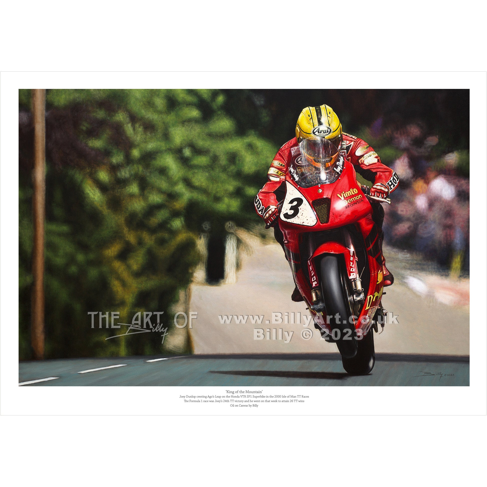 This Limited Edition Fine Art Print 'King of the Mountain' of Road Racing Legend 'Yer Maun' Joey Dunlop - Riding the Honda VTR SP1 cresting Ago's Leap on the way to his 24th TT race victory. Joey went on to win a further 2 races that week, the lightweight and ultra-lightweight TTs at the age of 48, to amass his Record Breaking 26 TT victries.