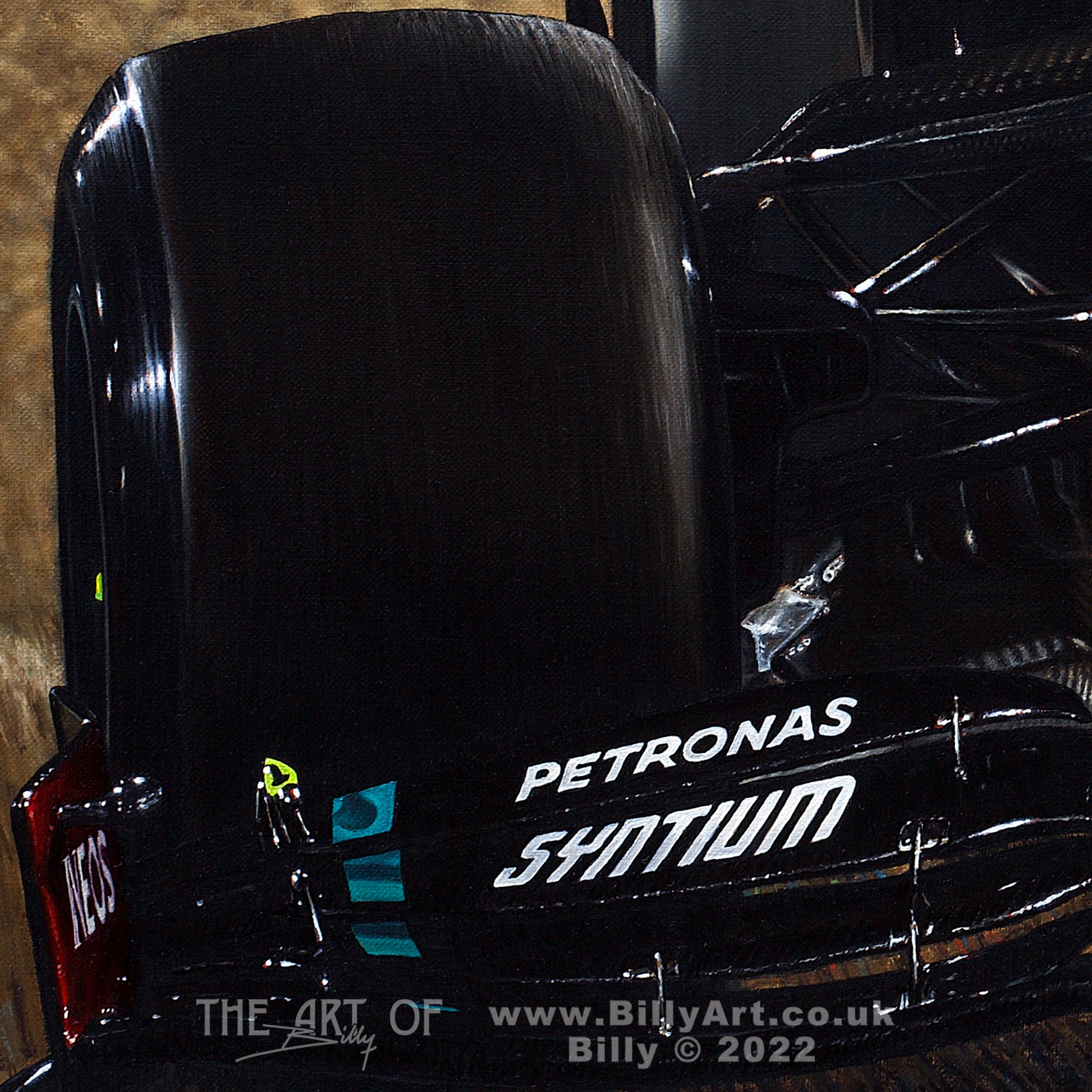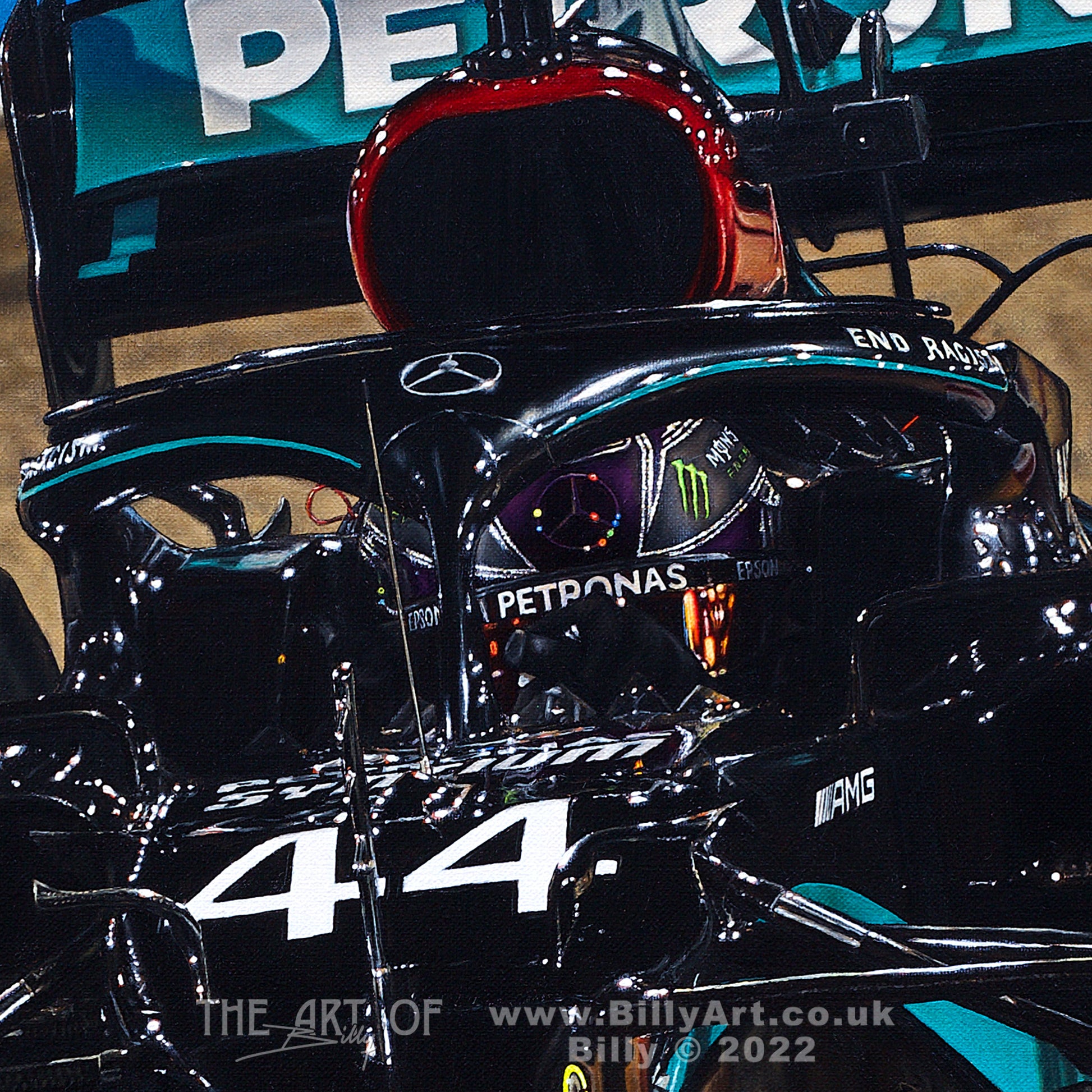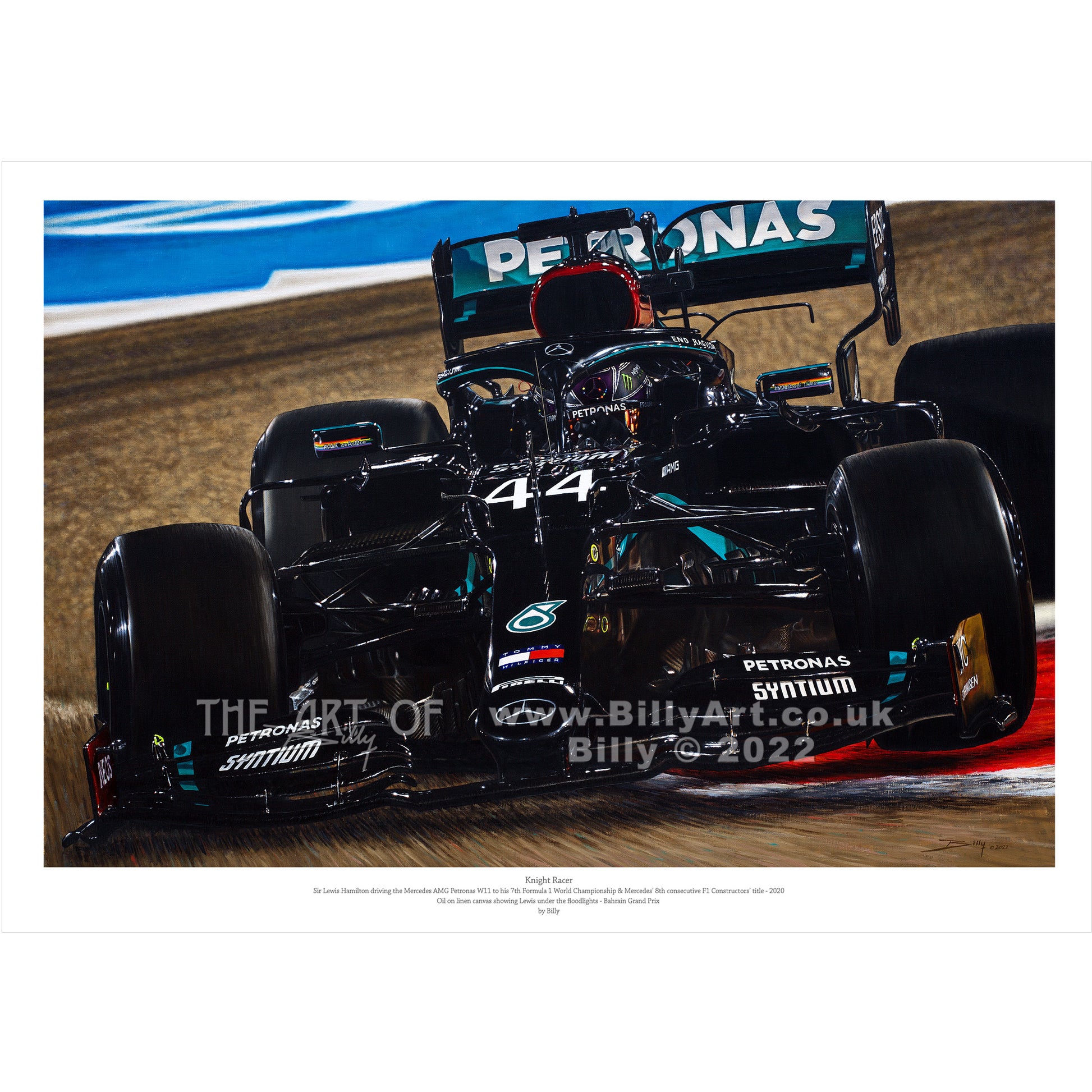This is a limited edition fine art print of Lewis driving the Mercedes AMG Petronas W11 race car under the lights at the 2020 Bahrain Grand Prix. Lewis became the 7 times F1 World Champion, equalling Michael Schumacher's record, and Mercedes the record breaking 8 times consecutive constructors' champions.