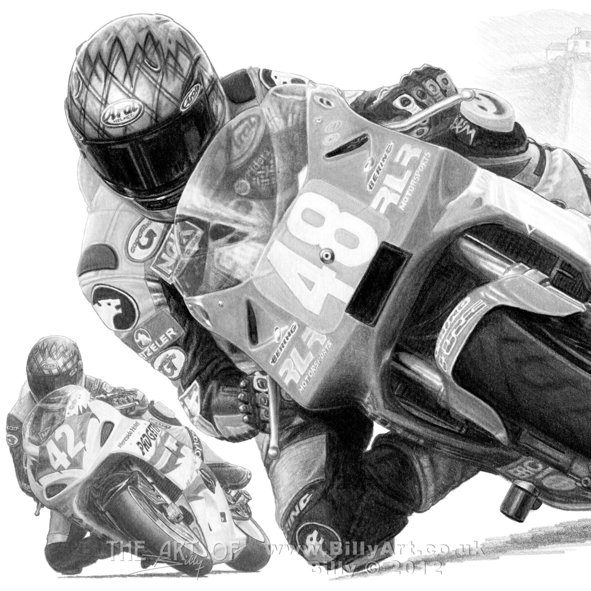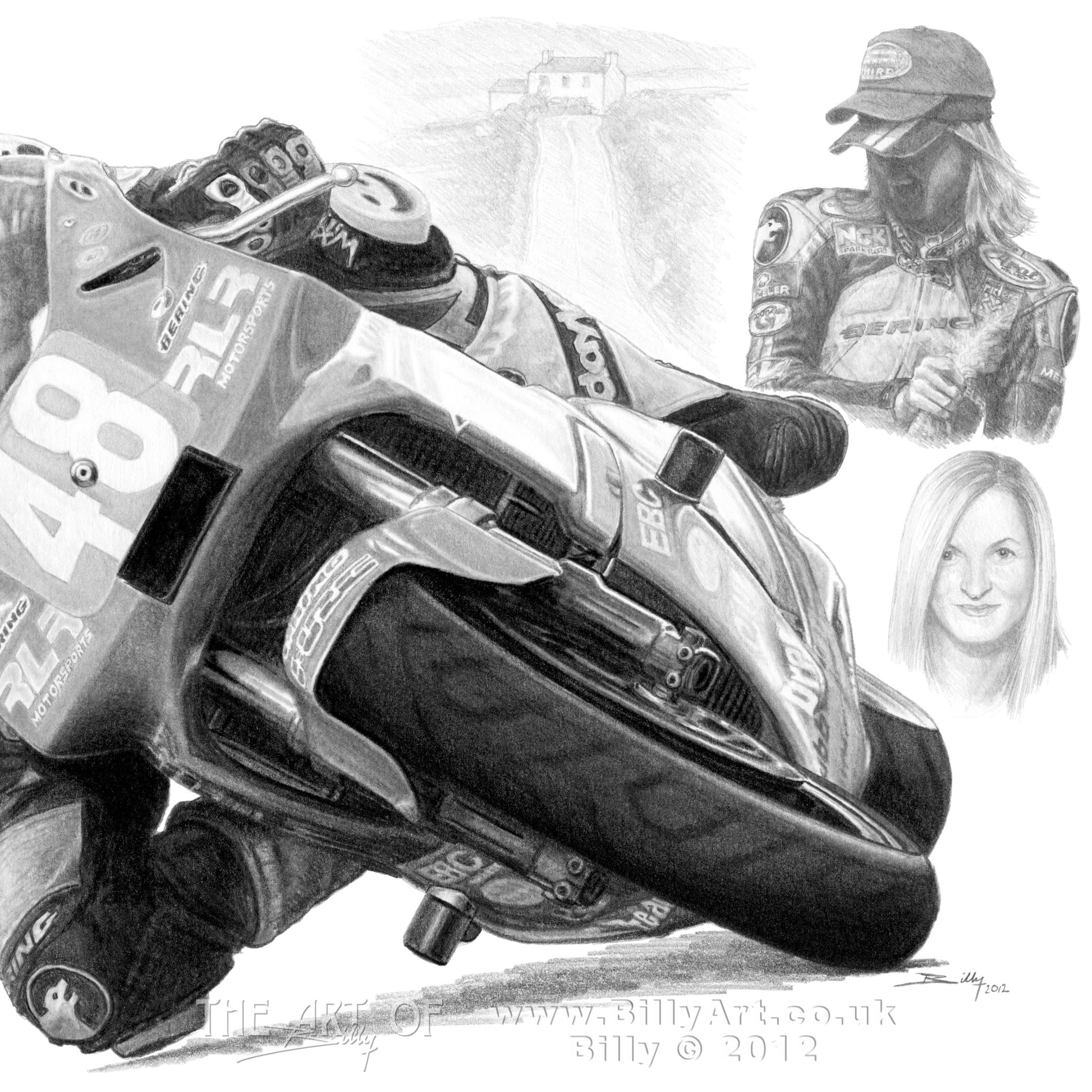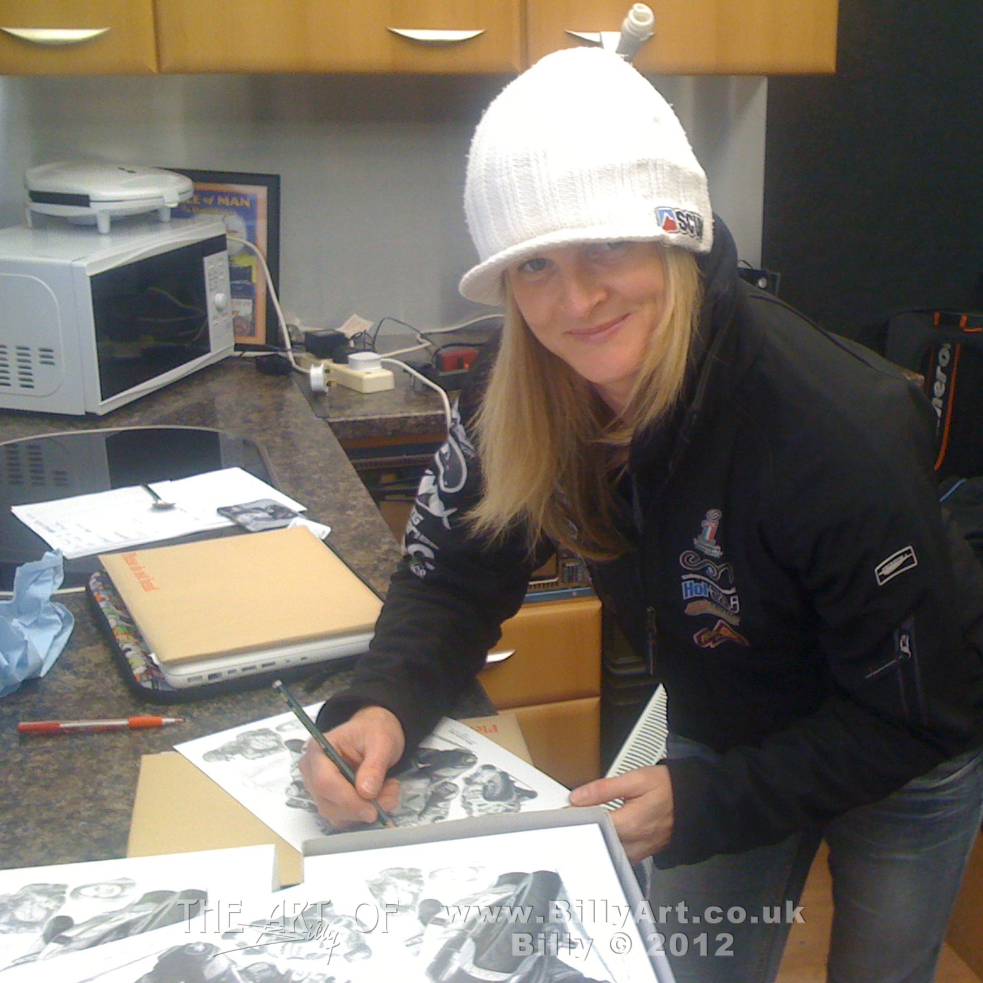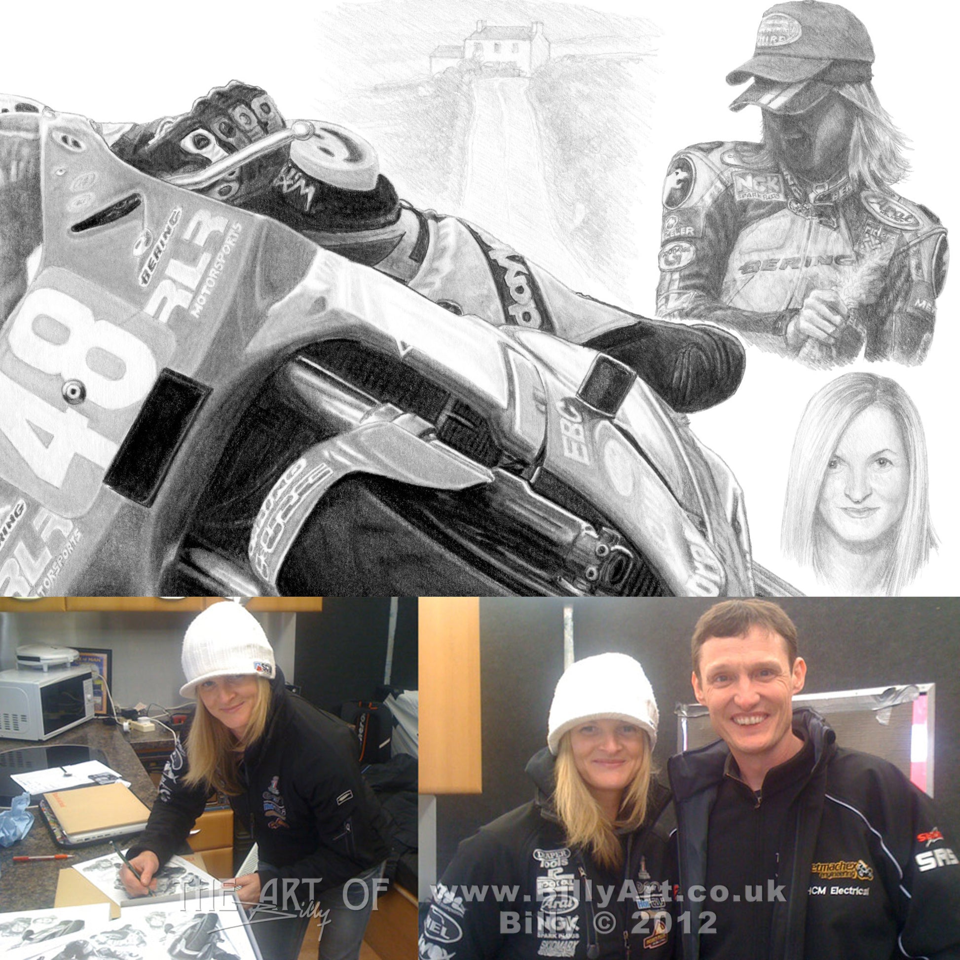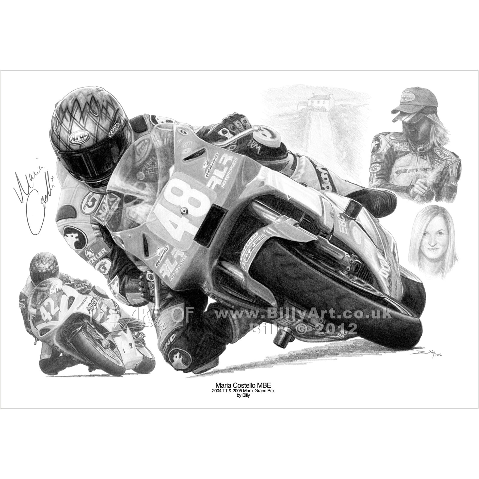 The image shows Maria Costello riding the Pagetts Suzuki GSXR K2 in the 2004 Isle of Man TT Production 1000 race to her fastest lap of the TT - 114.73mph - in the bottom left of the image. And Maria on the RLR Honda in the 2005 Manx Grand Prix coming down from Kate's Cottage to the famous Creg Ne Baa pub on the Isle of Man on her way to her podium. Below is Maria signing the print at the 2012 Isle of Man TT Races.