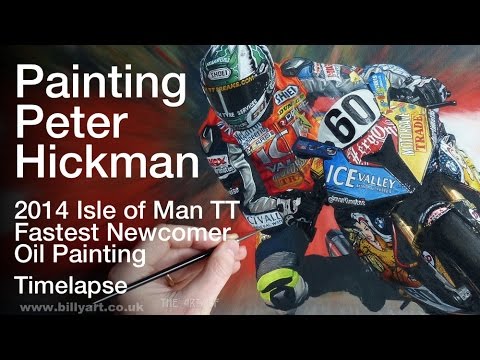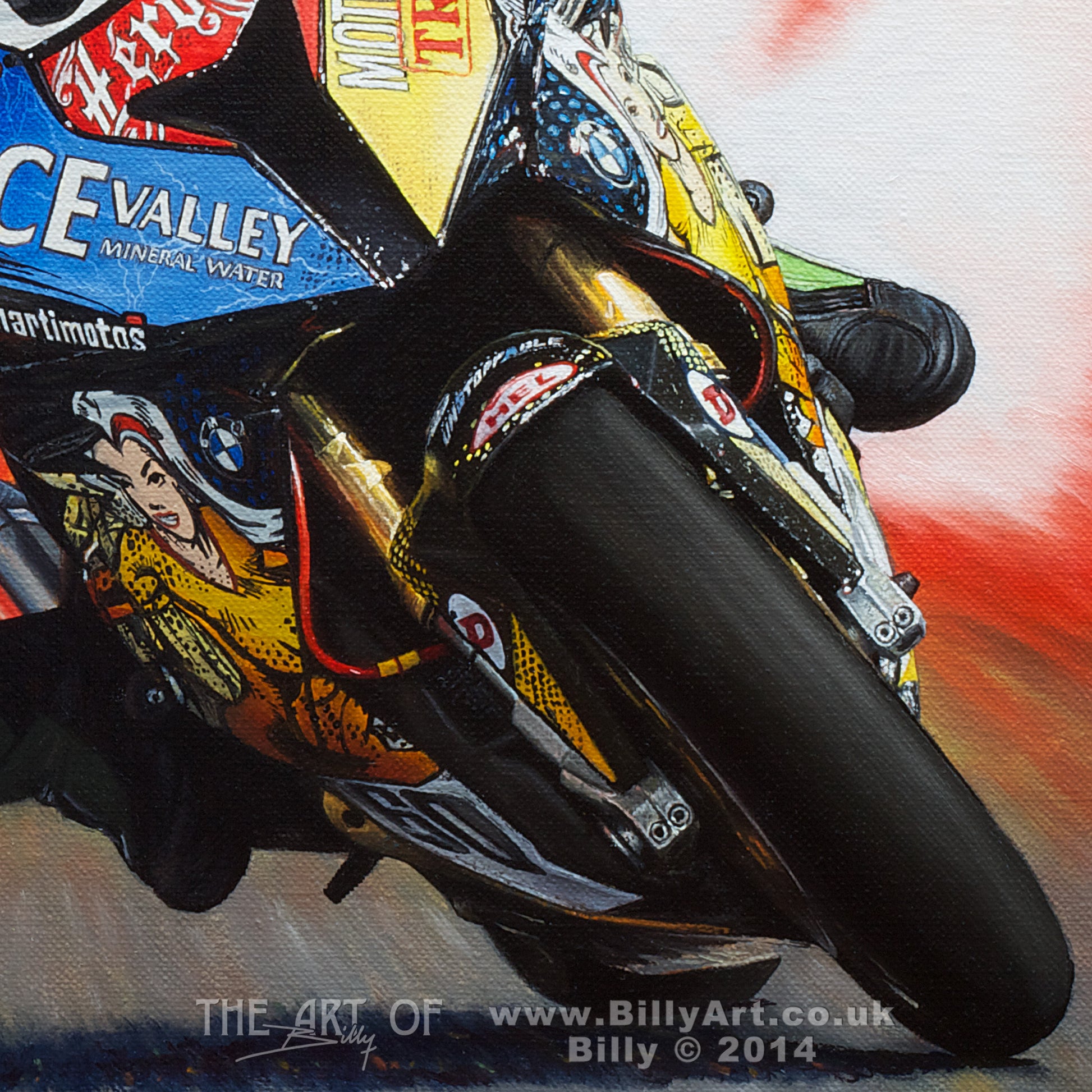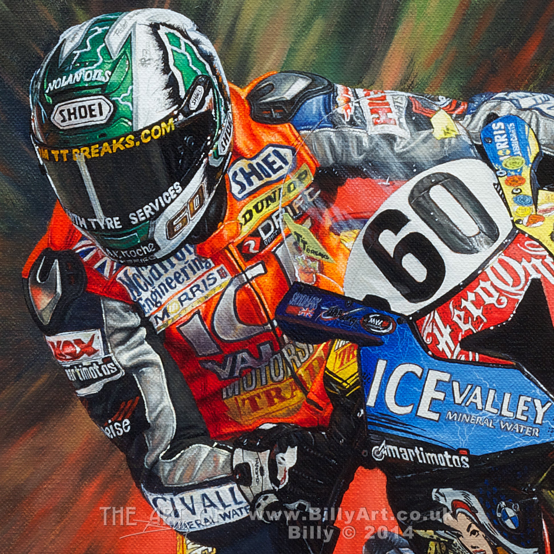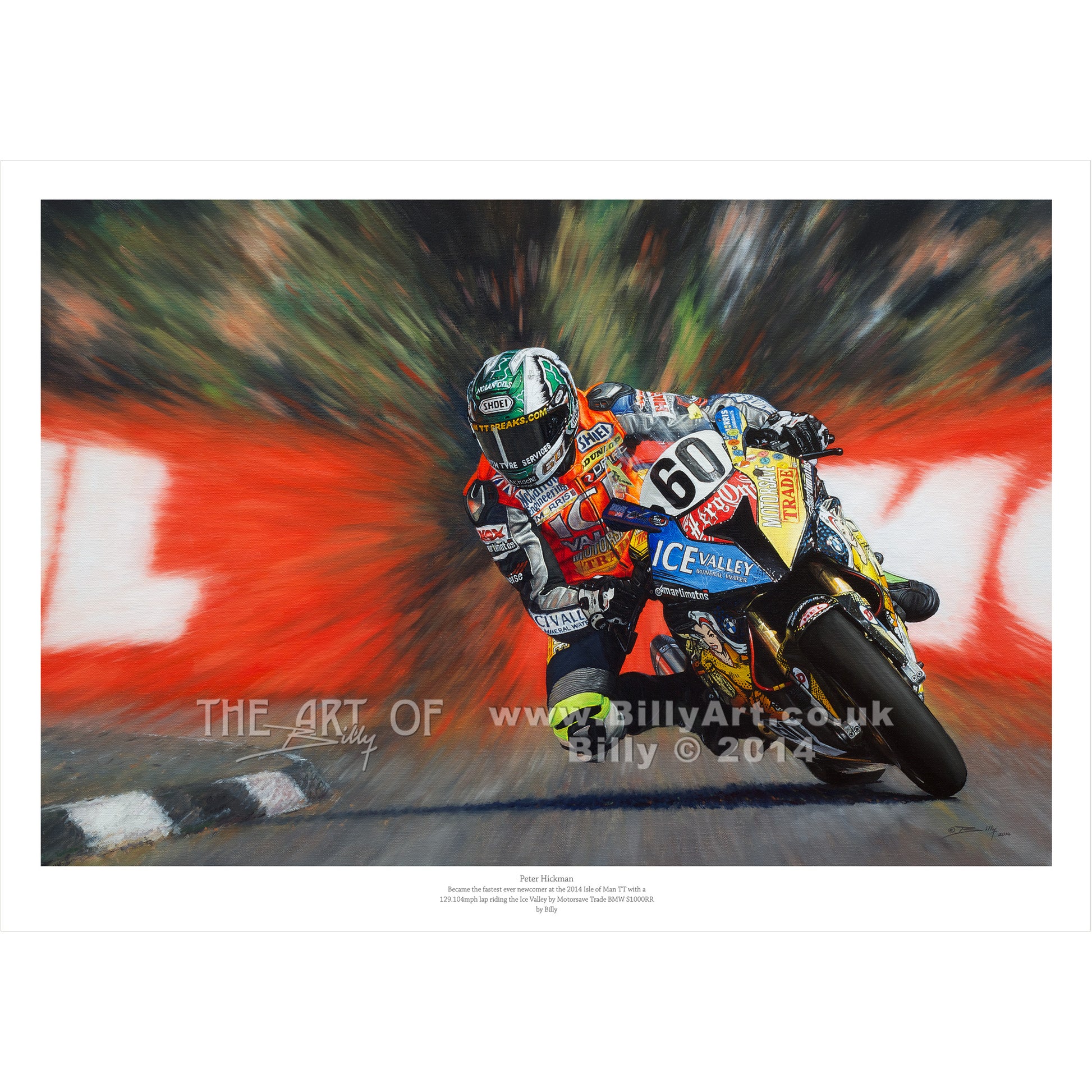 This oil on linen canvas painting by Billy of Peter Hickman riding the Paul Shoesmith prepared Superstock Ice Valley Racing by Motorsave Trade BMW S1000RR race bike on his way to becoming the fastest ever newcomer at the famous Isle of Man TT races with an incredible average speed lap of 129.104mph is available in three sizes A4, A3 and A2.