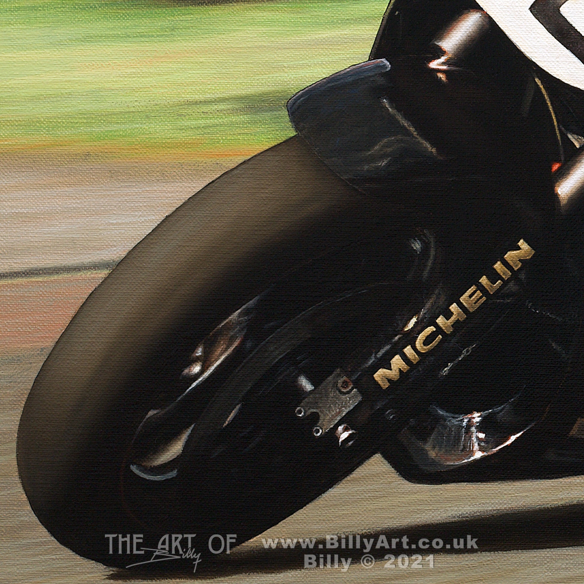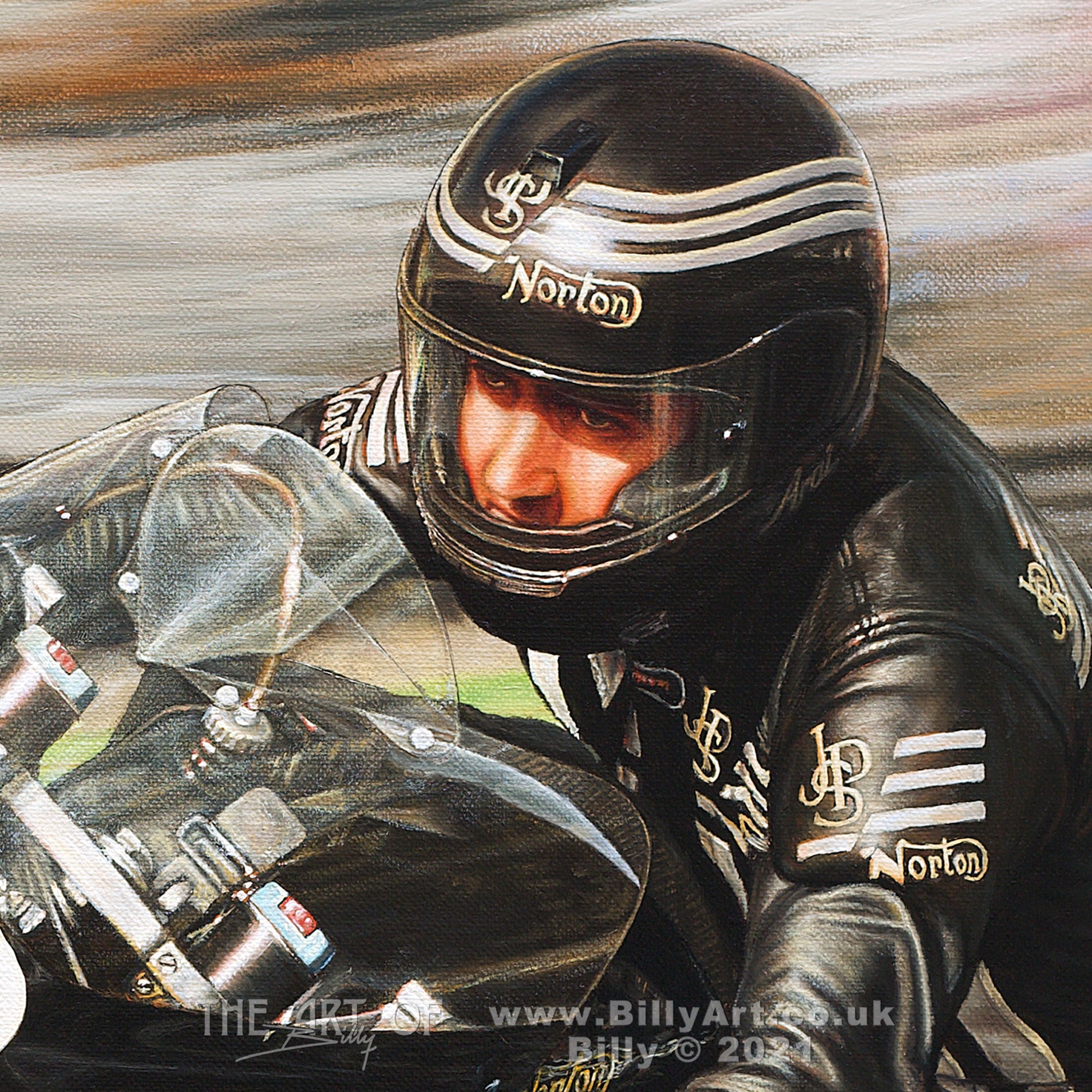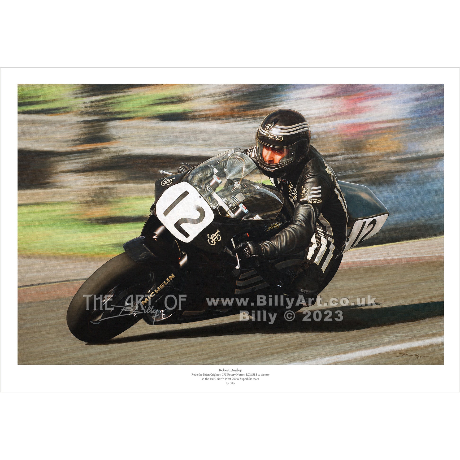 Robert Dunlop JPS Norton 1990 North West 200 oil painting limited edition fine art print by Billy.