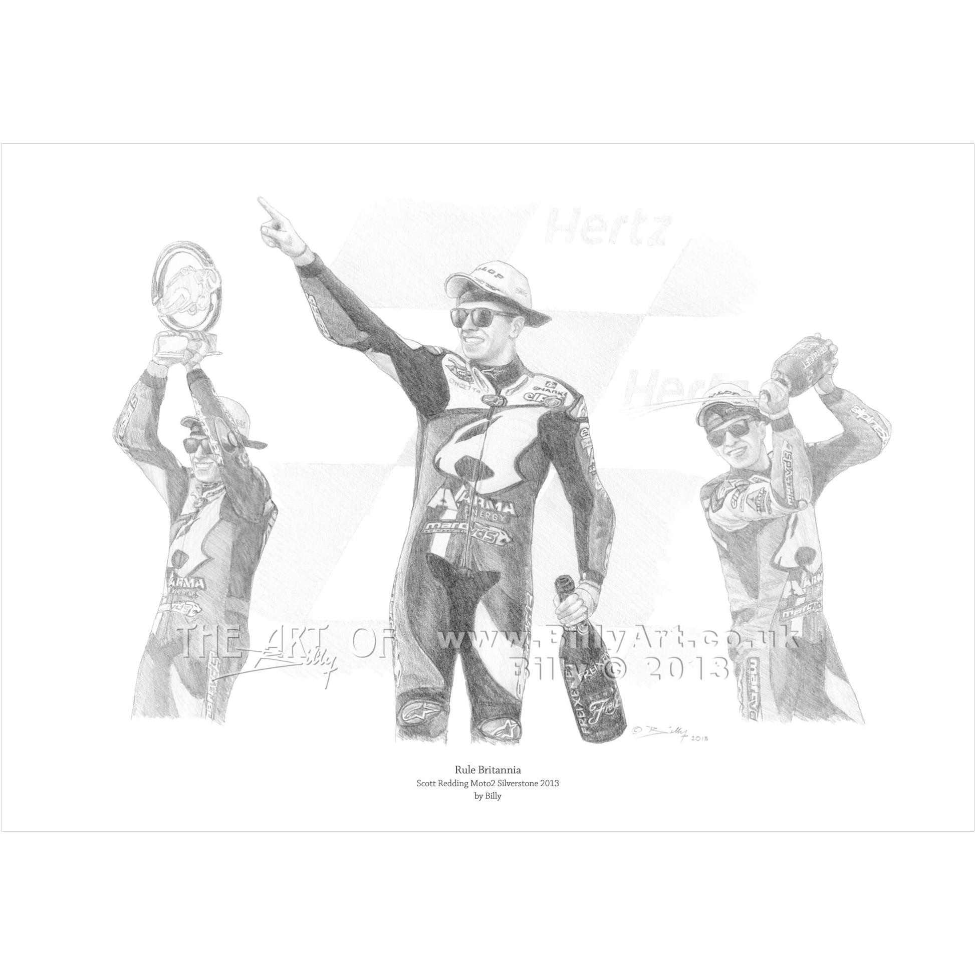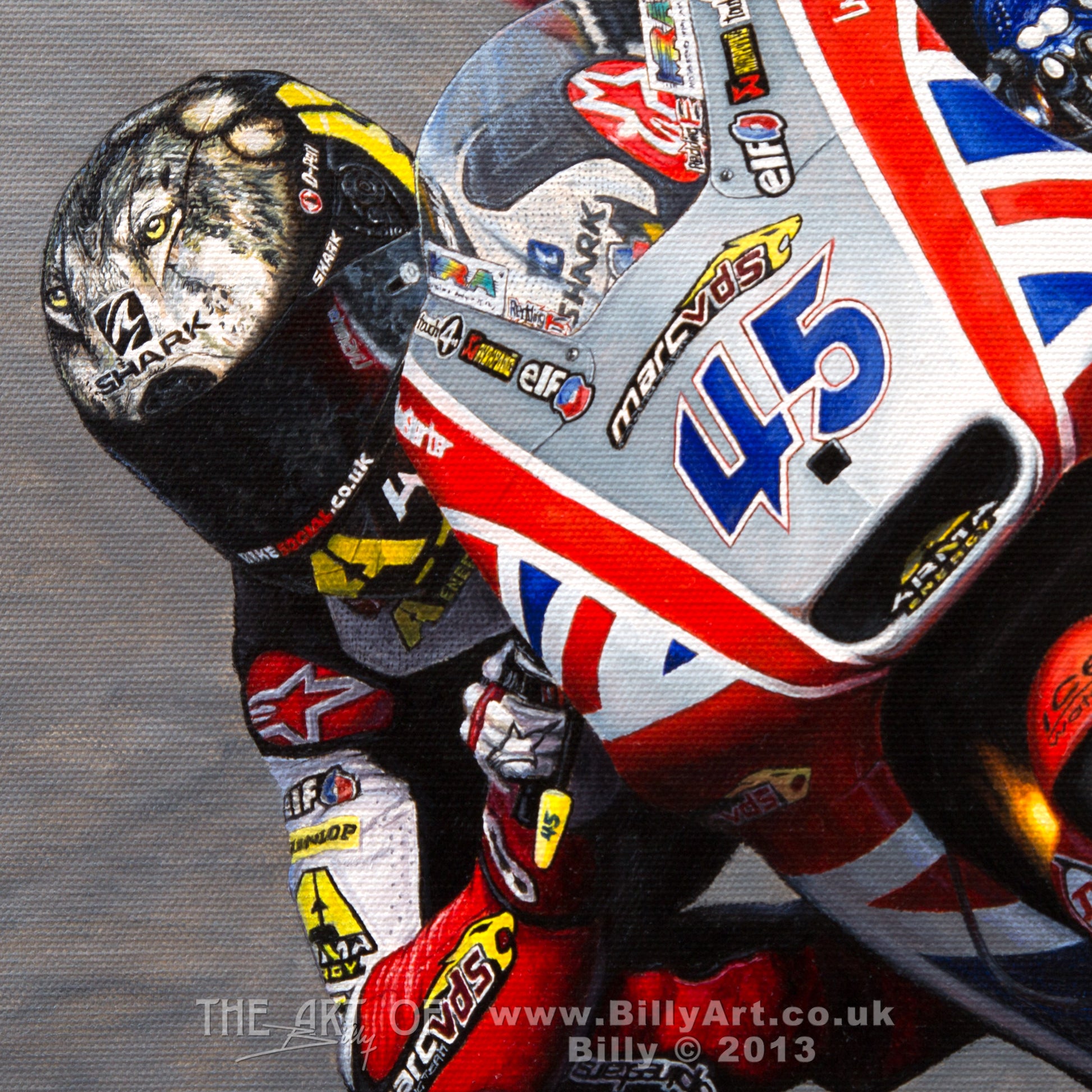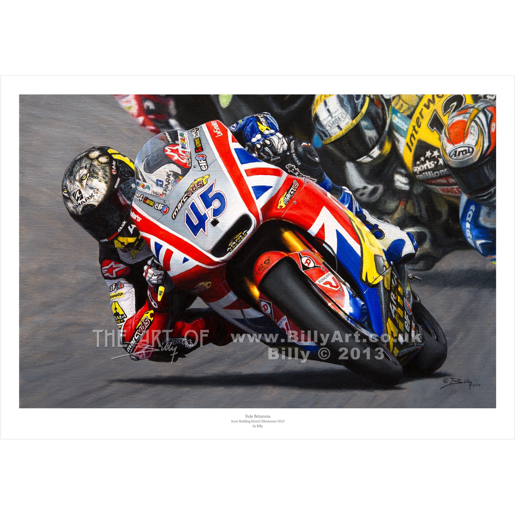 This oil on canvas painting by Billy shows Scott Redding riding the Marc VDS Moto2 race bike resplendent with the Union Jack to his historic win at his home GP at Silverstone in the 2013 Moto2 championship MotoGP support class. The print is available in A3 and is embossed and signed by Billy.