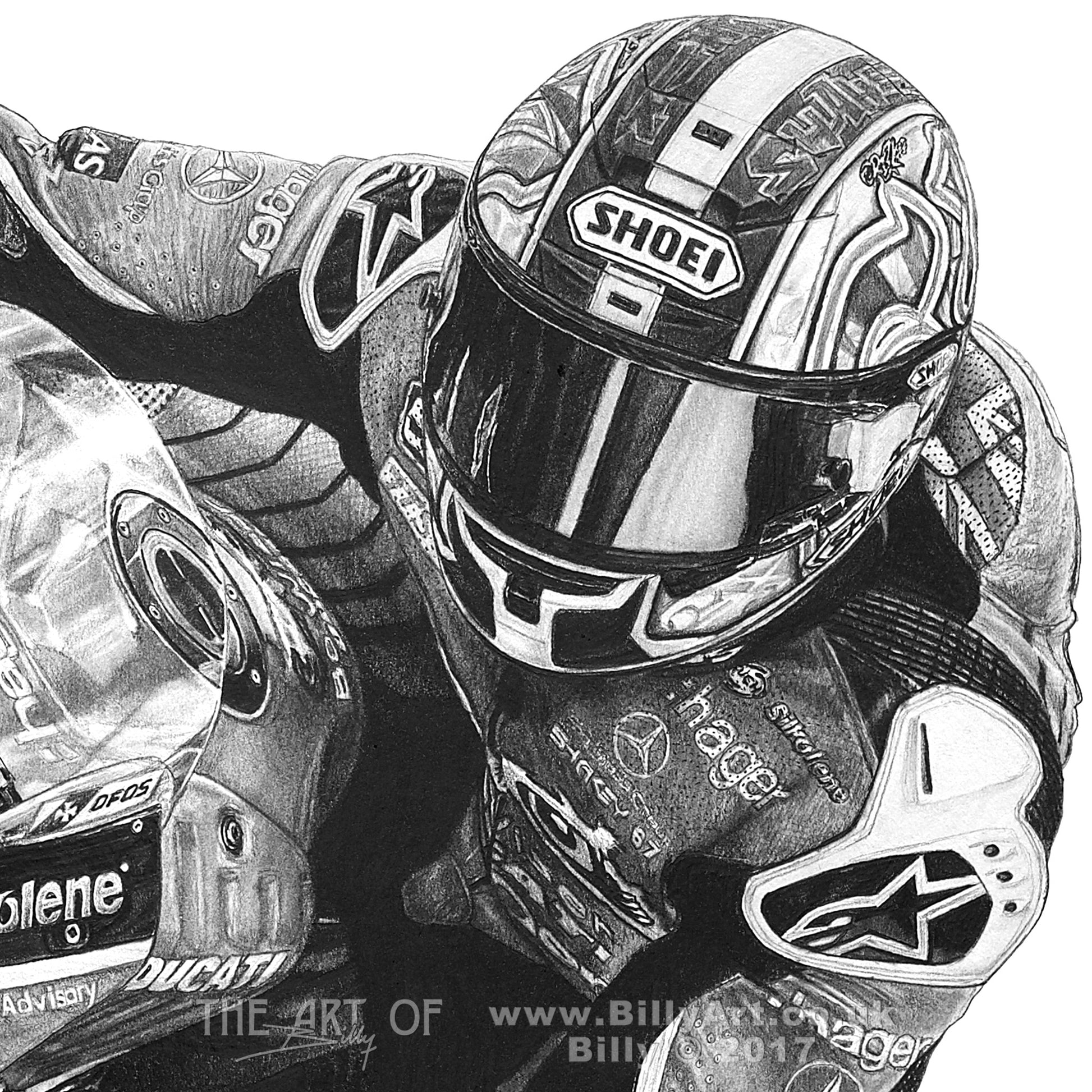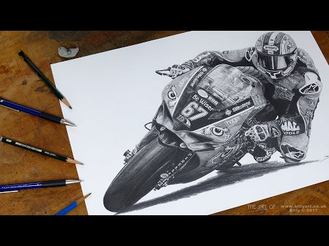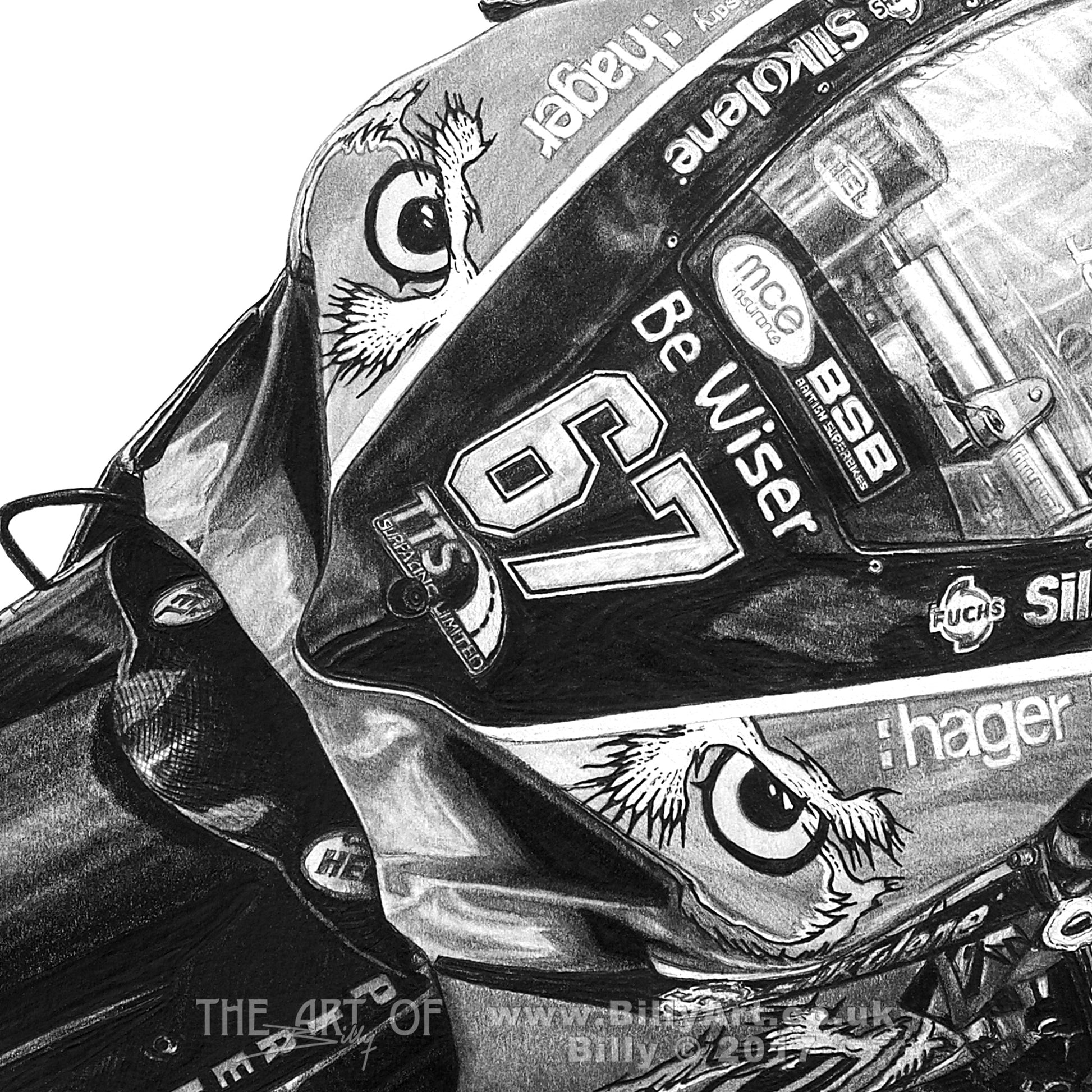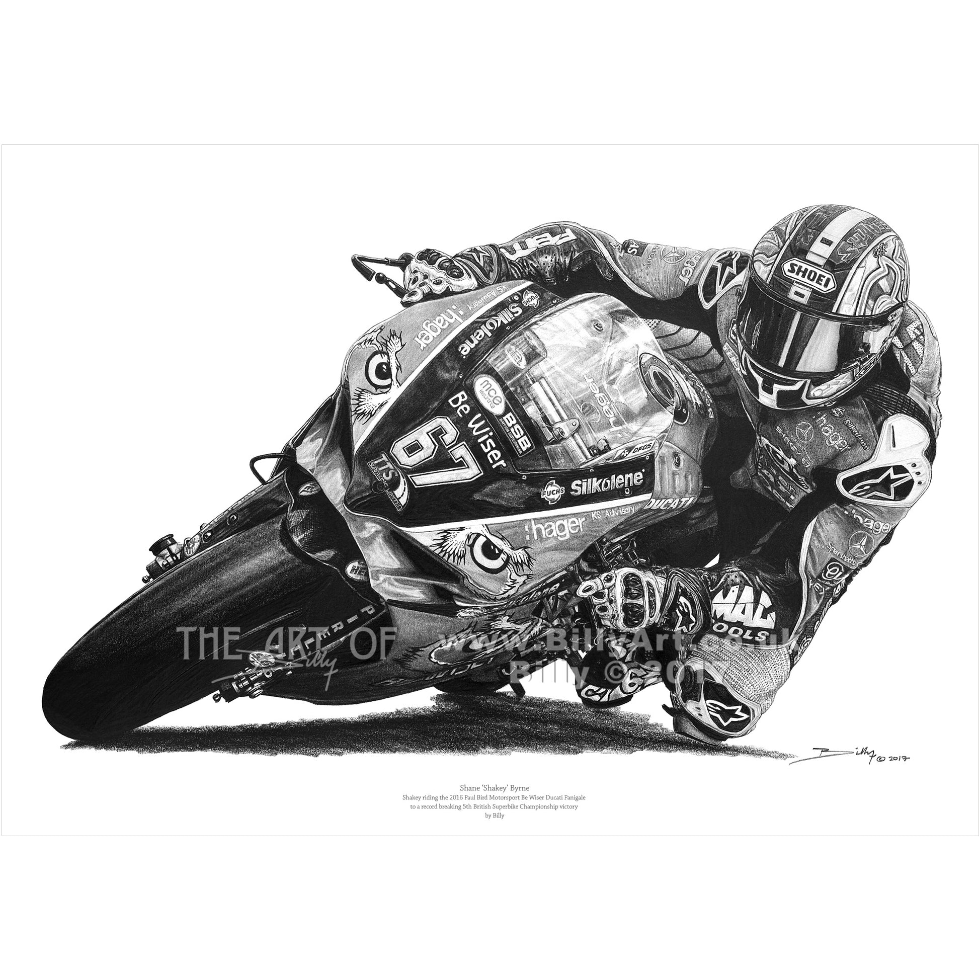This limited edition fine art print of Shakey taken from Billy's pencil drawing shows Shane riding the 2016 Paul Bird Motorsport Be Wiser Ducati Panigale in the British Superbike Championship. Shakey made BSB history by winning the British Superbike Championship for a 5th time on the PBM Ducati.